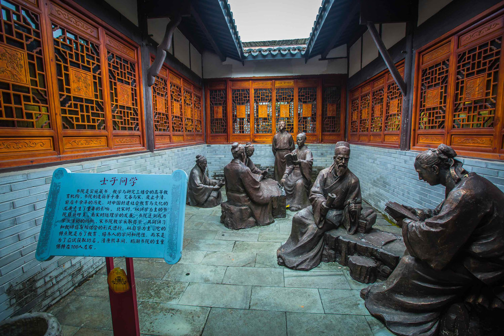 书院里的石雕重现了“鹅湖之会”的场景。南宋淳熙二年(公元1175年),当时著名的哲学家吕祖谦、朱熹、陆九渊和陆九龄等人齐聚江西省铅山县鹅湖山鹅湖寺,历时三天进行了一场“理学”与“心学”的激烈交锋。