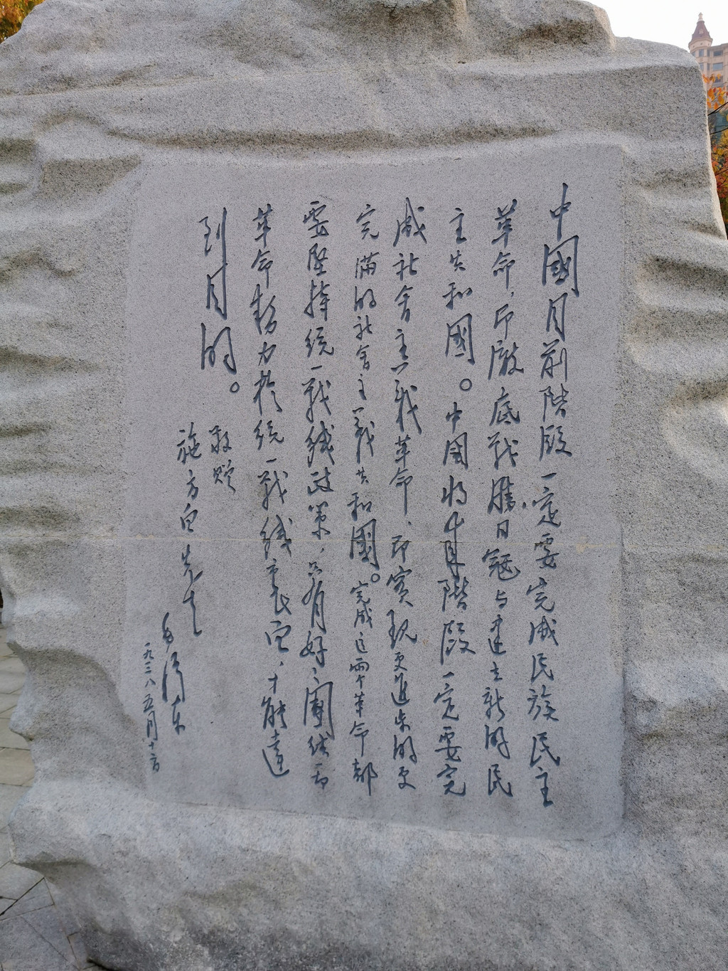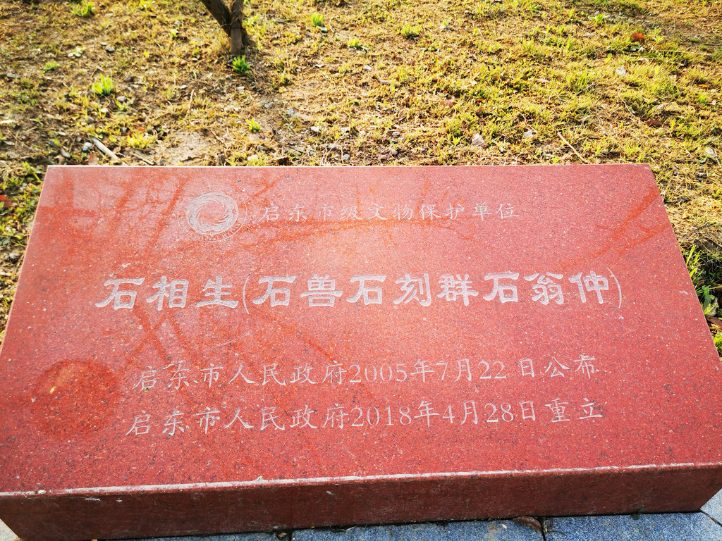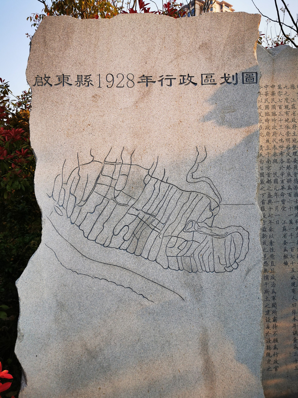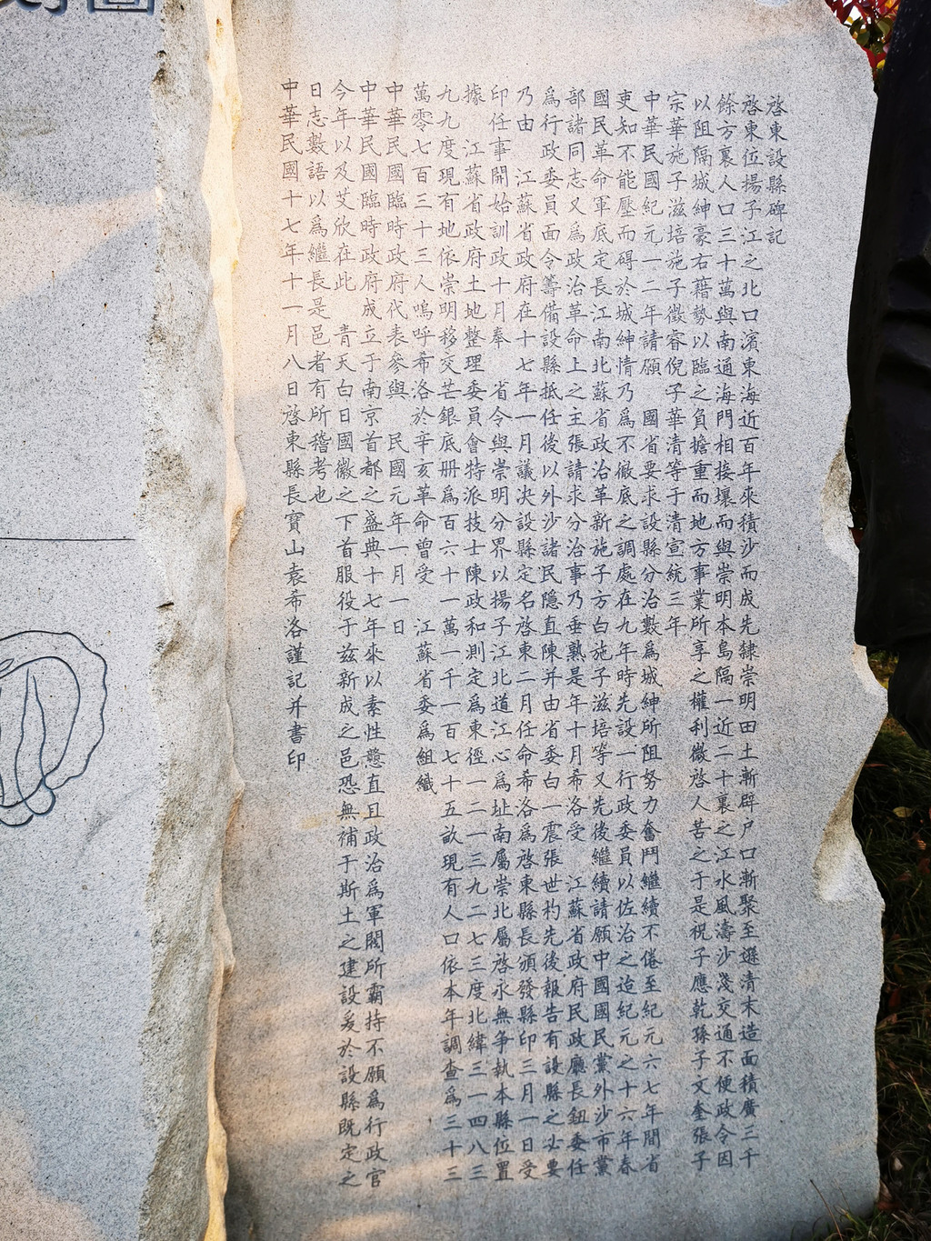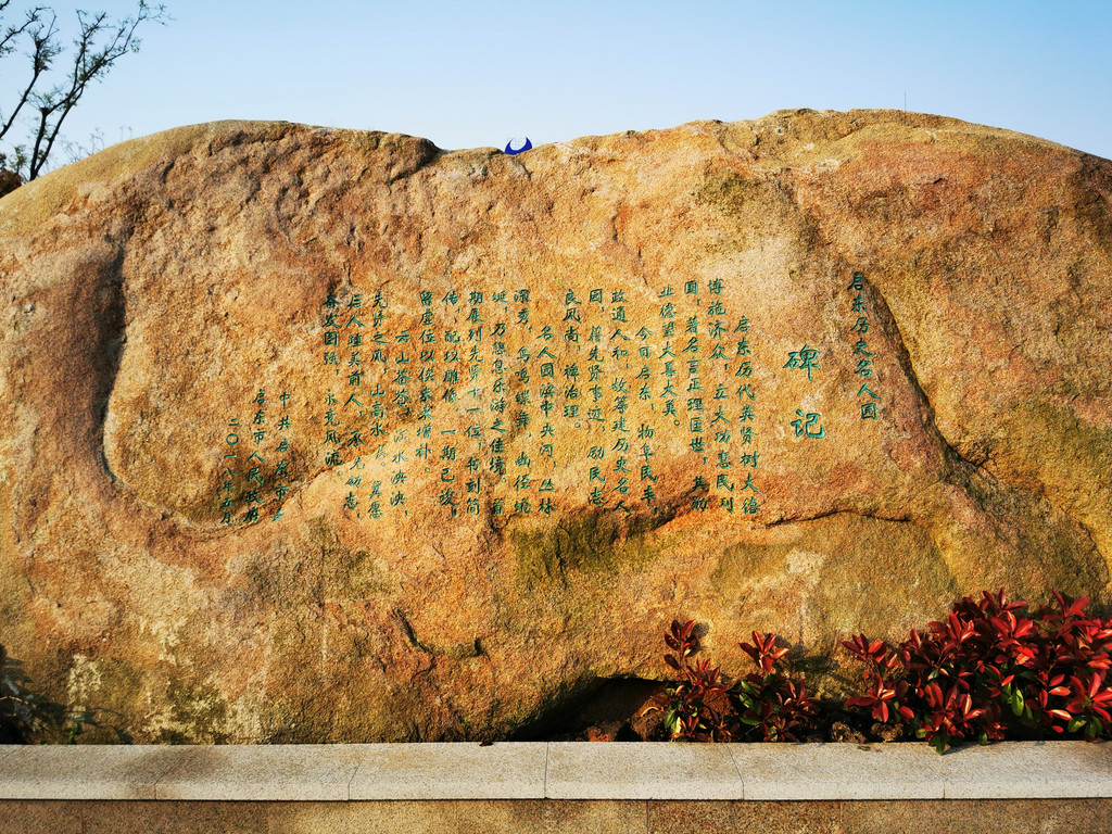 巨石的背面刻有碑记,洋洋洒洒163个字:“启东历代英贤树大德博施济众,立大功惠民利国,著名言正理匡世,其勋业德望大善大美。今日启东,物阜民丰,政通人和,故筹建历史名人园,籍先贤事迹,励民志,良风尚,禆治理。名人园滨中央河,丛树深秀,鸟鸣蝶舞,幽径蜿蜒,乃憩息乐游之佳境。首期展列先贤十一位,书刻简传,配以雕像。一期已竣,留虚位以俟未来增补。云山苍苍,江水泱泱,先贤之风,山高水长,冀愿后人踵美前人,承先励志,奋发图强,永竞风流。”