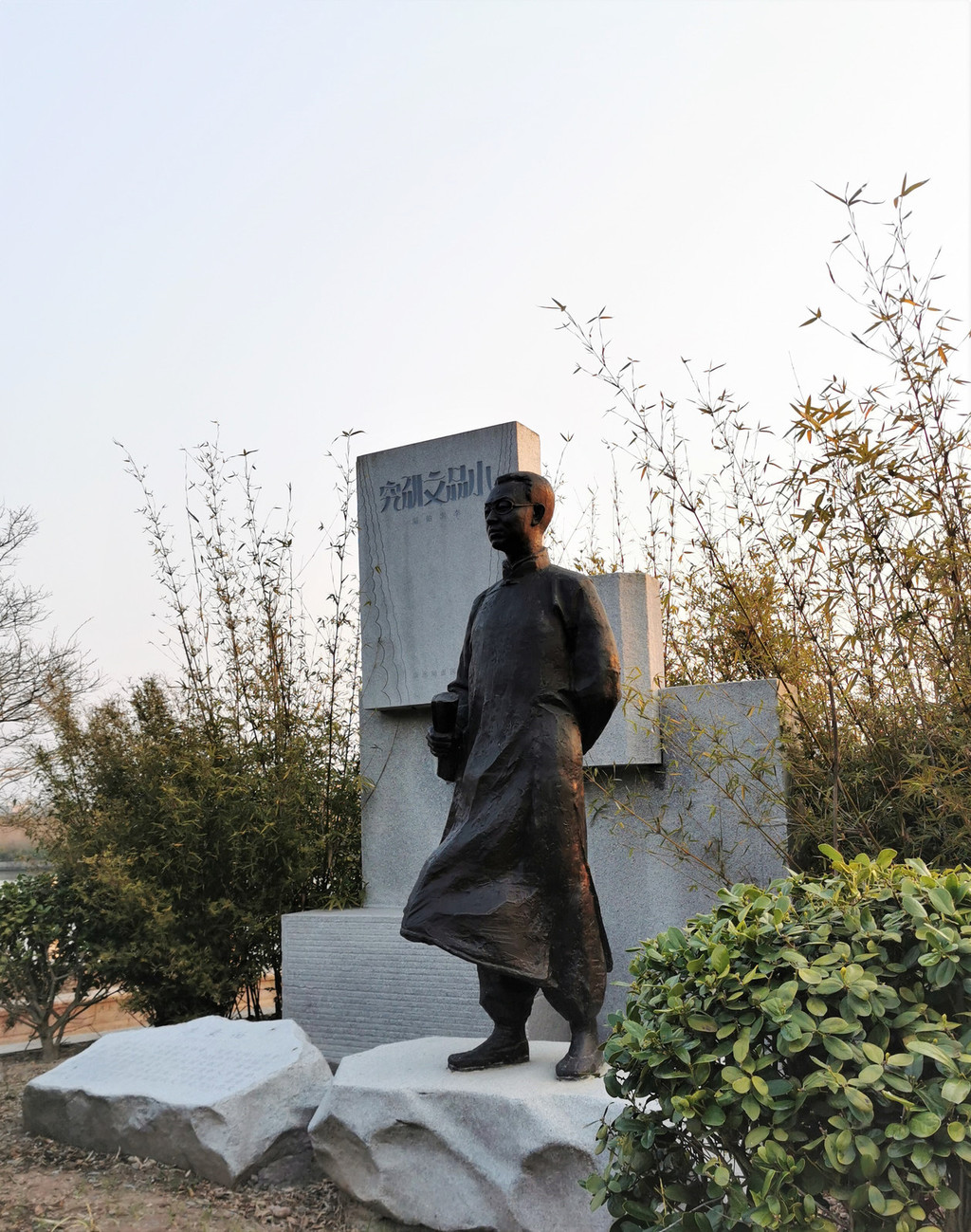 从施简烈士塑像继续向东走是李素伯的塑像。李素伯生于1908年,殁于1937年,仅活了29个春秋就英年早逝了。他原籍海门中和镇,后迁居启东海复镇。早年在家乡读书,1923年考入南通师范,毕业后历任南通实验小学、南通乡村师范学校国文教员。1933年秋回到母校通师执教,直至1937年3月去世。李素伯是位才子,既是现代诗人、作家、学者,还是散文理论家,除了众多诗文书画外,他的著作《小品文研究》是中国现代文学史上关于小品文研究的第一本专著,是我国小品文研究的开辟草莱之作,其筚路蓝缕之功,泽及后世,是李素伯对现代文学做出的突出奉献。李素伯身着长袍,清秀的脸上戴着一副大大的眼镜,手执书卷,袍角被风吹起,瘦弱的身材仿佛抵御不住风的吹打。塑像的背景是两本书《小品文研究》和《春的旅人》,均为他的佳作。