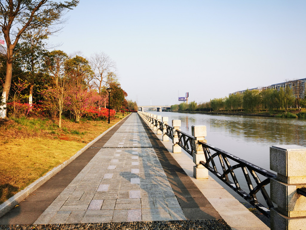再前行是石板铺就的滨河步道,河边有铁艺栏杆。步道一侧是清清的中央河水,一侧是绿绿的花草树木,景色怡人。河面上有水鸟飞翔,不时扎入水中衔起小鱼。