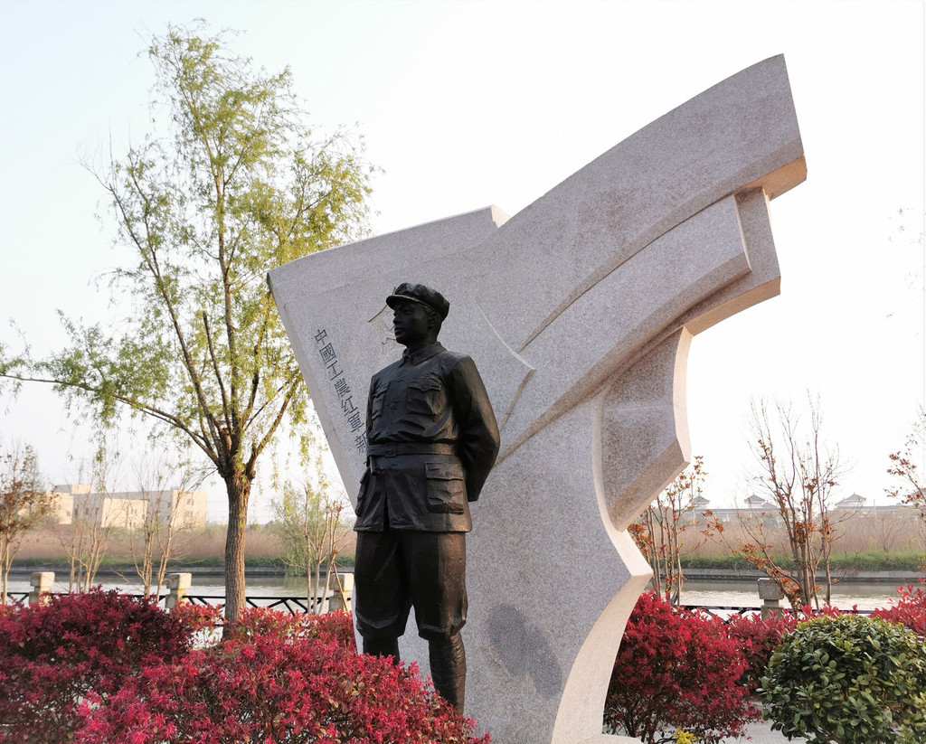 从沈轶公塑像沿河滨的步道继续向东,这里的河面开阔,向北望去可见烈士纪念碑和新殡仪馆等建筑物的身影。此处还是观日出的好地方,因为这里没有高大的建筑物,清晨时分,一轮红日喷薄而出,红光四射。继续前行就到了施简烈士的塑像。施简烈士头戴八角帽,身着工农红军的军装,腰带上插着驳壳枪,打着绑腿,双手背在身后,英姿飒爽。身后是飘扬的新红十二军的军旗。