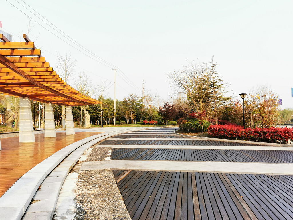 沿张成龙塑像向东走,是铺着木板的滨河平台,有木制遮阳廊架。