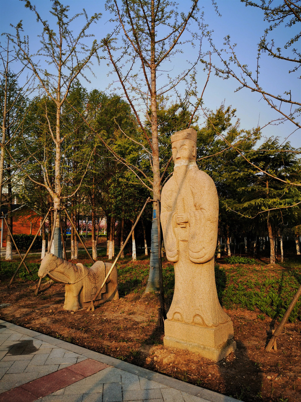 河中偶见运货驳船驶过,不紧不慢缓缓前行,跑步人的速度都比它快。前行不久就到李磐硕的塑像了,其身着清代官员服饰,手执书卷,目光炯炯。
