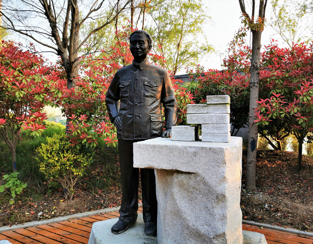 从陶桂林塑像向东,再折向北走到河边就到了公园北桥了,从桥下通道穿越桥梁再前行百米是沈轶公的塑像。身着中山装的沈轶公站立在教案旁,桌上是厚厚的书本,背景是3段白墙,墙上还有窗户,是否寓意他在大兴镇的故居?