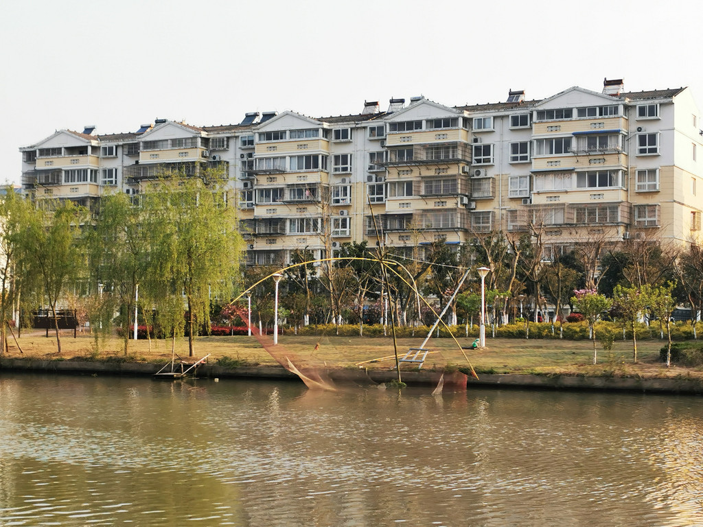 河对岸有架久未见到的扳网,有人不时拉着绳索起网,网中大多空空如也。