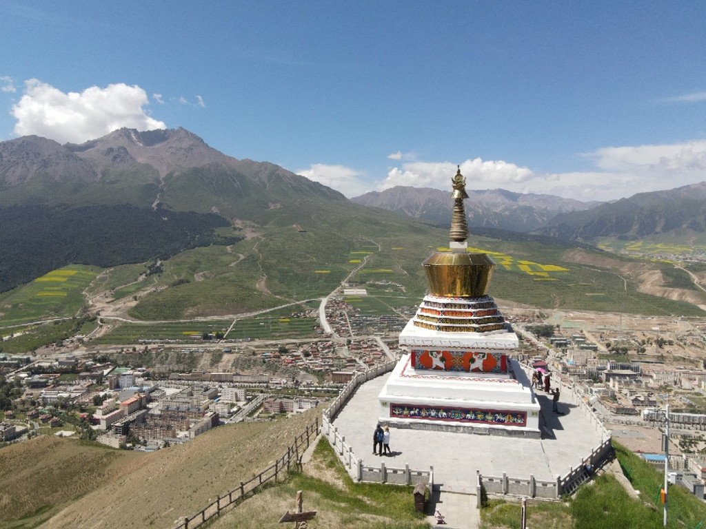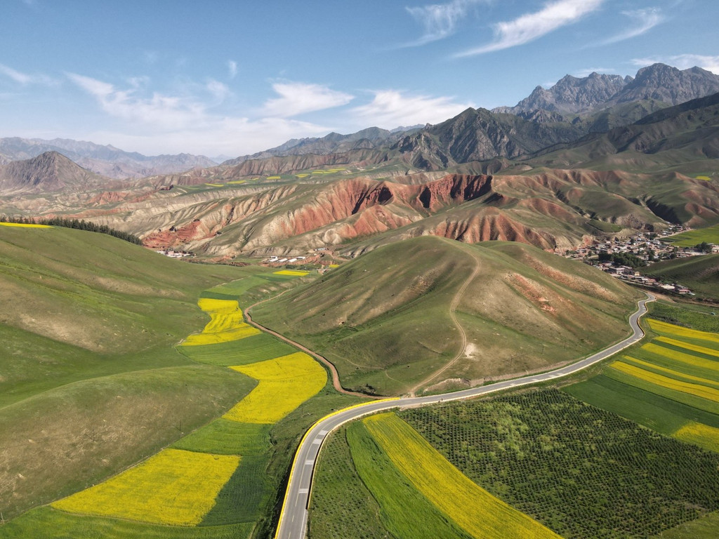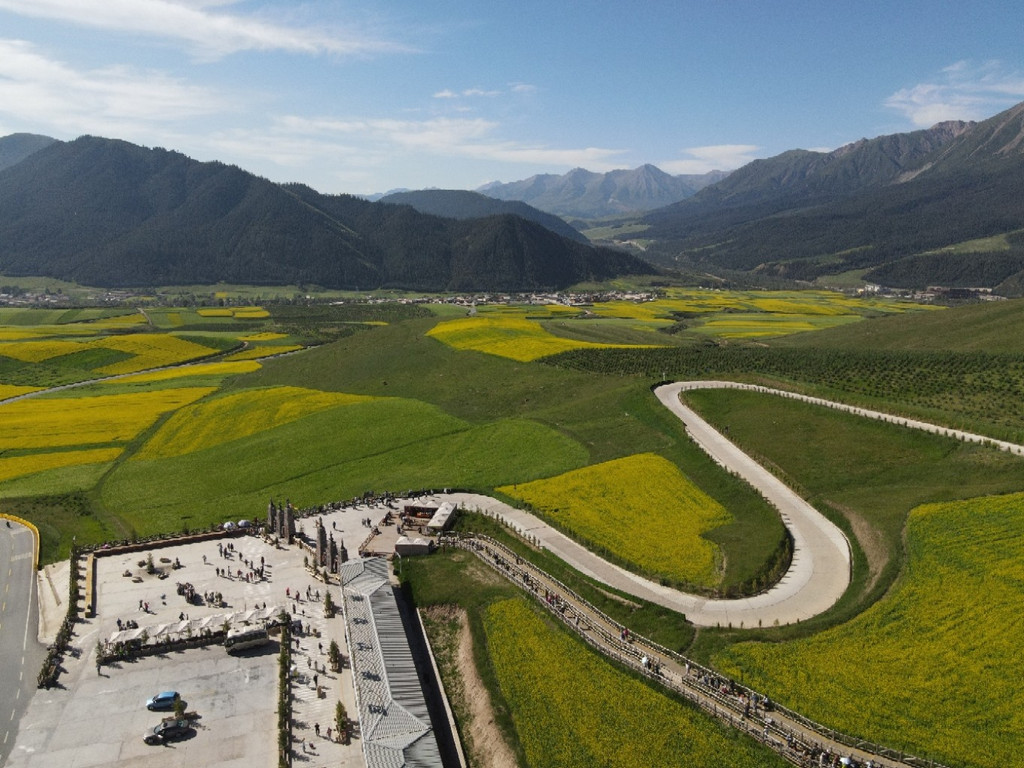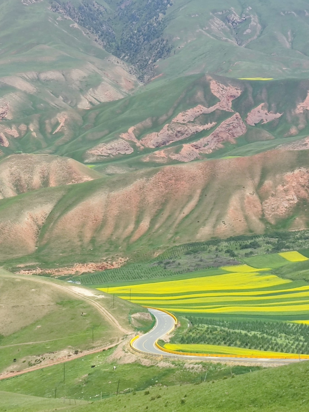 放眼望去,山下的青稞、油菜花、村庄、河流交融在一起,不同的色彩交相辉映,宛如一幅浓墨重彩的水墨画。