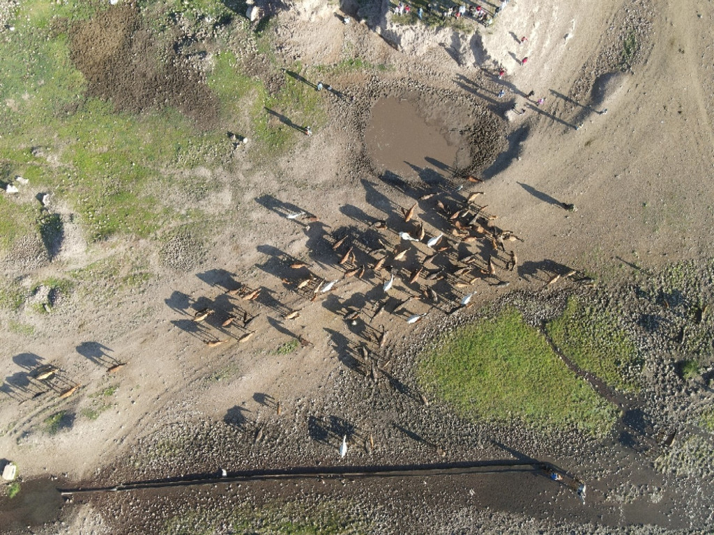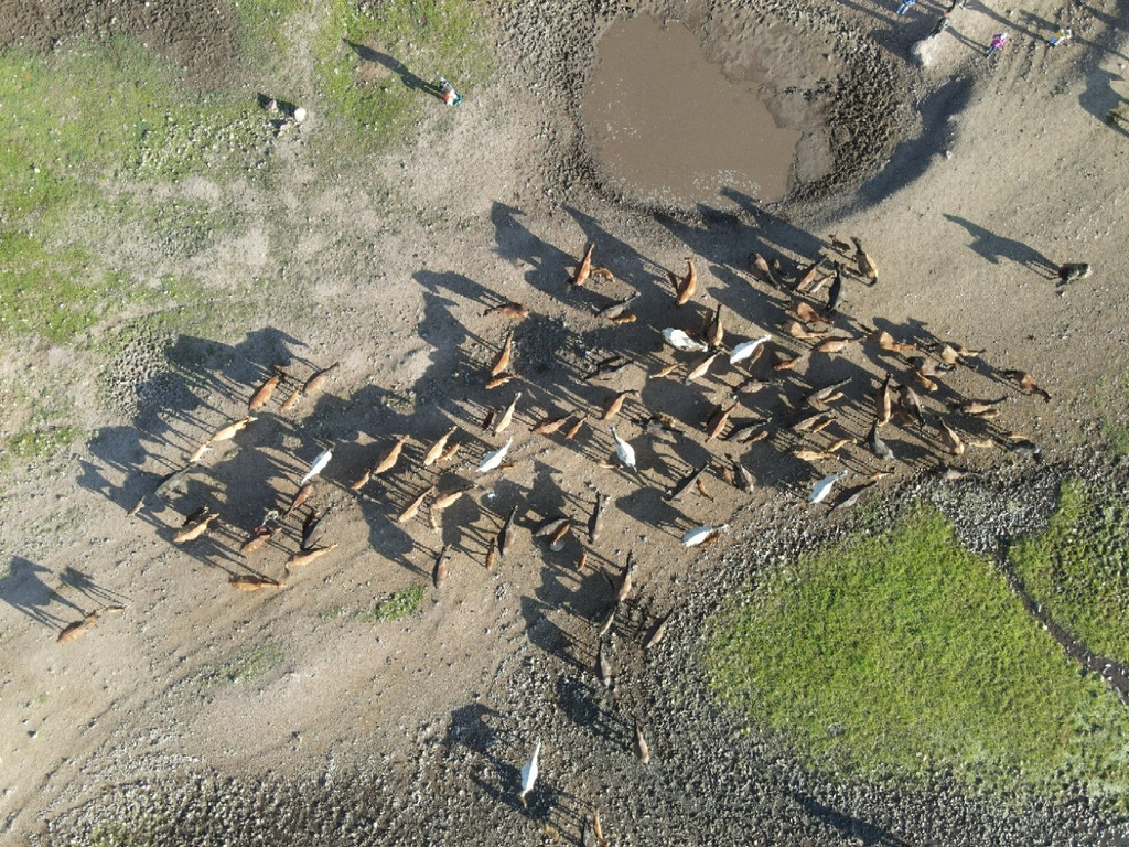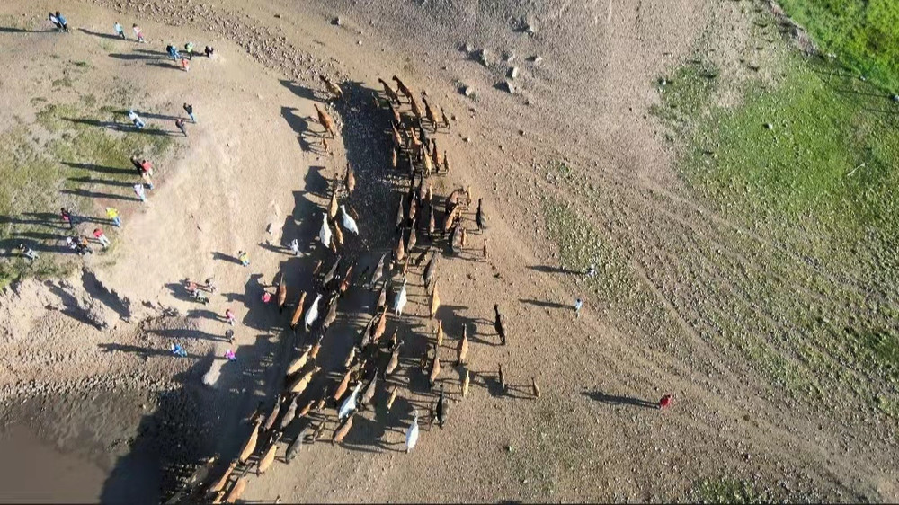 这就是航拍视角下的“万马奔腾”,脑海里面可以想像一下:“蓝天白云下,一匹匹雄健的骏马疾风骤雨般从一望无际的草场呼啸而过,长鬃飞扬,响声如雷……”。