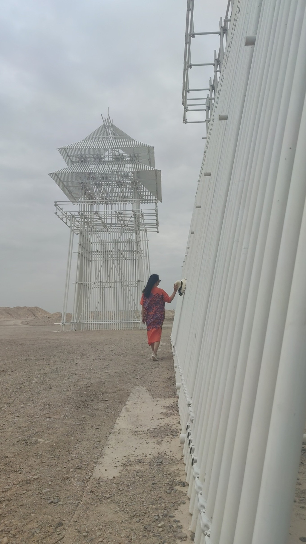 这件雕塑作品使用建筑工程用的特殊定制的脚手架6000多根,使用3万多的扣件连接,由于光线不断的变化,在风力的作用下,会在大漠中产生众多迷人的景象,尤其是在日落时分拍出的景象,更加虚幻飘渺。