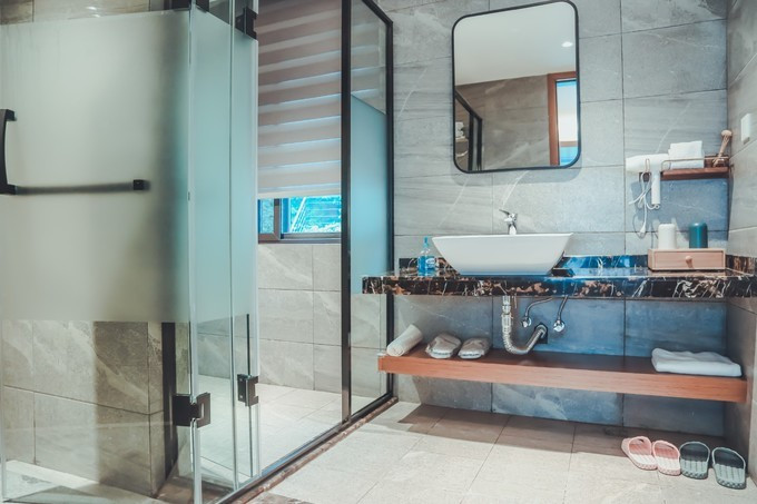 最赞的就是这个180度全景落地窗,阳光倾斜,多了一丝慵懒感……推窗而立,扑面而来的就是山野原始的空气,一大片绿意占据眼眶。窗边还配有浴缸,可以边泡汤边看景,运气好的话晚上还有可能看到璀璨的星空~