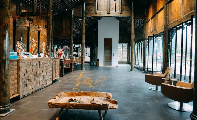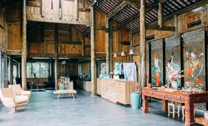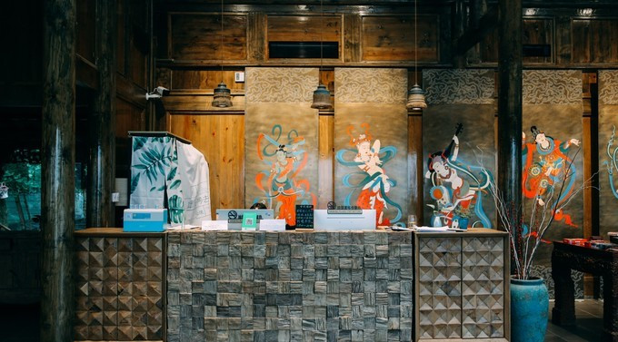 海拔1000米天然吸氧地,乘坐电梯上楼,大堂是老房子改造的木质结构和黑瓦屋顶,棕编、玉石还有请老手工艺人制作的飞天形象铜皮画,每一个细节之处都充满巧思。