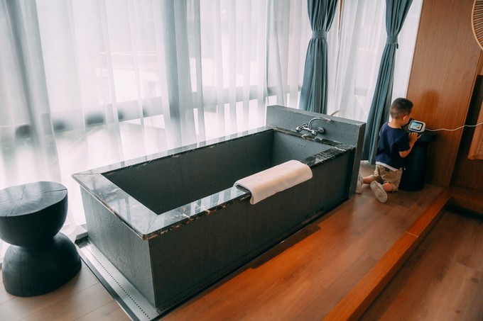 开放式浴缸引入了 青城山 天然山泉,天性爱玩水的两个孩子一起在浴池里嬉戏玩耍,水温冷热调节方便,不用担心会感冒啦!