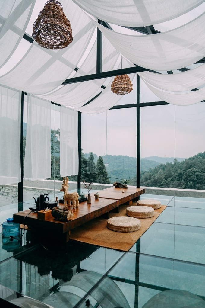 于我而言,最喜欢的莫过于网红拍照的“漂浮茶室”,270度全透明漂浮茶室,席地而坐,静赏帘外青山,细品香气四溢的茶香,没了繁杂的世俗事干扰,在山境中享受一刻轻松。