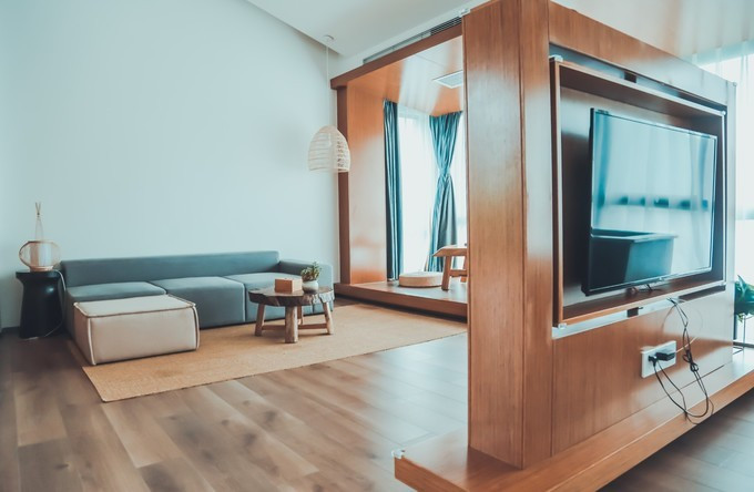 房间有个小型的榻榻米和沙发,大人们在这悠闲地喝茶,孩子们愉快地玩耍。房间十分宽敞,中间是一面可以旋转的电视墙,不管是在床上还是沙发上都能舒适地躺着看电视!