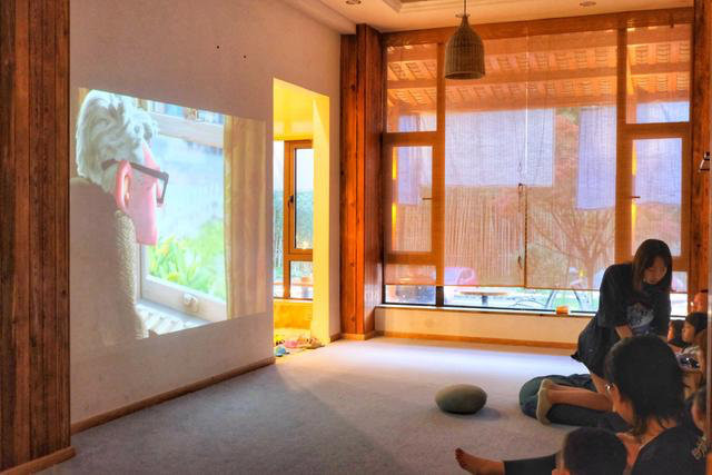 在等待中我在影音室和小朋友一起看动画片,虽然有些幼稚但是开心。在桐去隐泉酒店3000平方的空间中,有1600平方都是公共空间,用餐区、下午茶、放映厅、书吧、游戏室,走心的设施配备,让你的假期一点都不无聊。