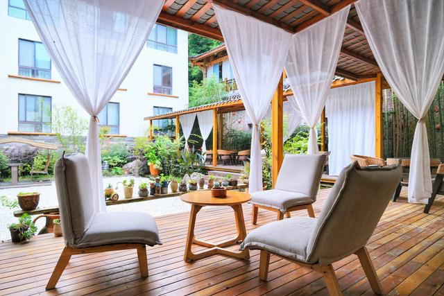 庭院周围搭建了木质结构的“长廊”,与山体、植物的色彩融合在一起,长廊边缘挂着青白相间的棉麻卷帘,随着青城山的风雨一起摇曳。