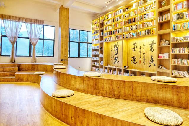 大落地窗使得室内通透明亮,整个空间也超大,背靠着青山绿水,边饮茶边阅书,充足的藏书量足够让你呆上一整天了。
