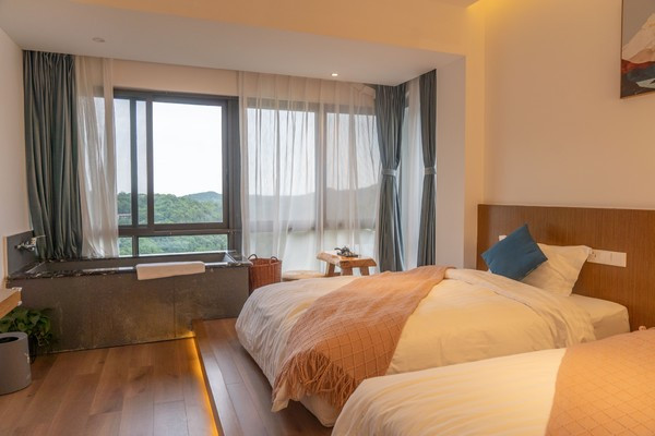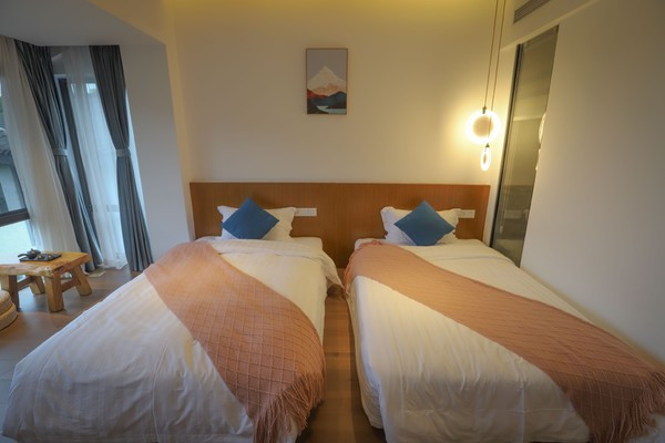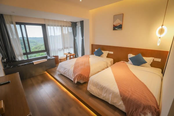 这次我们入住的是山景双床房,风格偏简约大气,房间以白墙、原木和水泥色为主,点缀着纯白素雅的床品,角落里还摆放着几簇绿植,整体看上去温馨又清新。