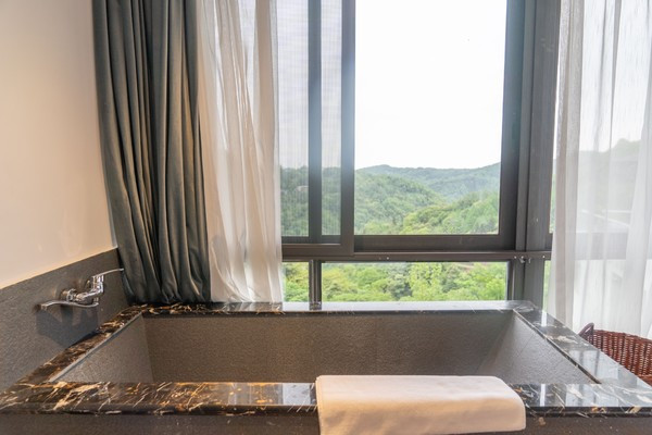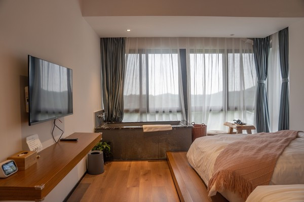 我最喜欢的一处设计是窗边的泡池,它与落地窗外的整片山林相应成景,还可以在泡澡的时候边看着窗外的风景,边舒缓整个身心,相当惬意啦。