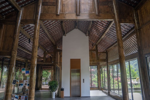 民宿顺山势而建,我们首先抵达的是一幢主楼,进门一楼就是停车场,二楼是餐厅,三楼才是接待大厅,从停车场还可以直接乘坐电梯直达大厅。