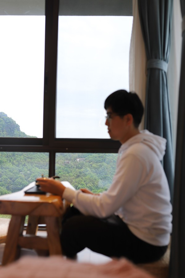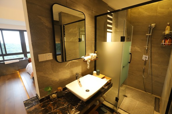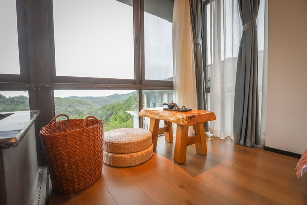 客房面积都在40㎡以上,最大的还有90㎡。每间房都可以观赏山景、而且配备泡池;一些房型中还带有超大的露台,视野堪比旅游景点的观景台,可以拍到180度的山景,还可以清晰地望见远处青城山上的老君阁。
