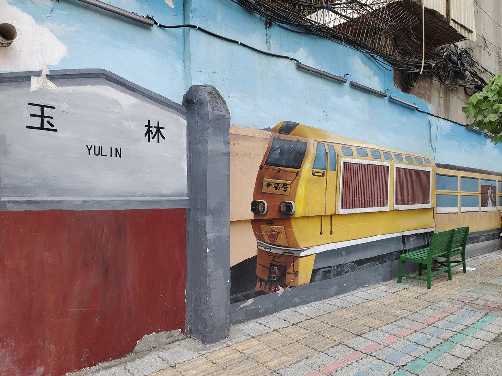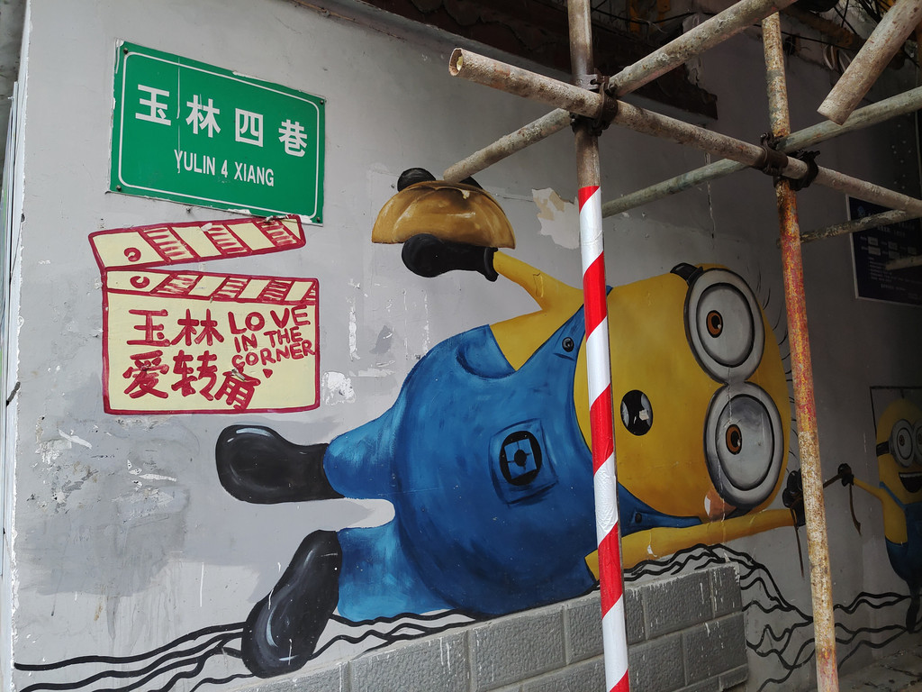 9、玉林路现在在改建中,涂鸦小黄人可以定位“玉林东路9号附2号”,是一个水果摊位。这里是玉林四巷,一条短短的涂鸦巷。然后从这里做起点,可以步行到“小酒馆”,一路上也有涂鸦画。