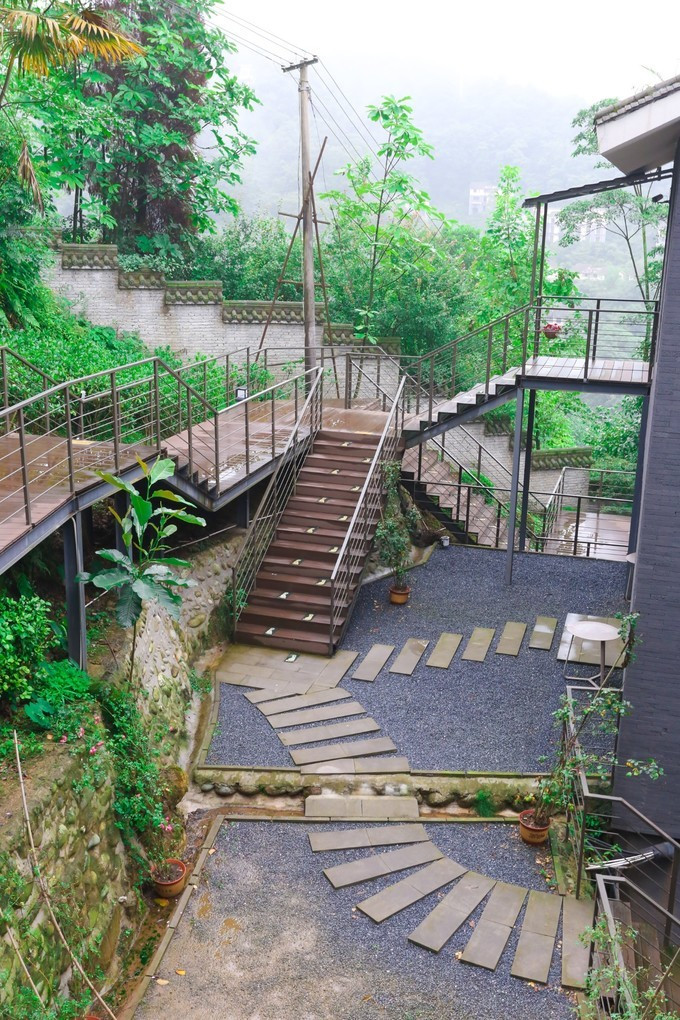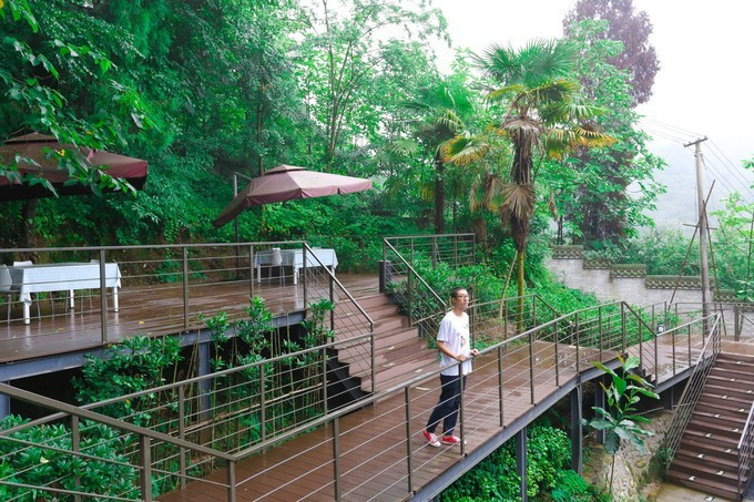 民宿的三撞独栋客房被郁郁葱葱的绿植包围着,可见青城山的生态环境真的超赞,民宿修建的木栈道也真的是走心了,穿过满眼的绿色就走到了我们的客房,亭台见。