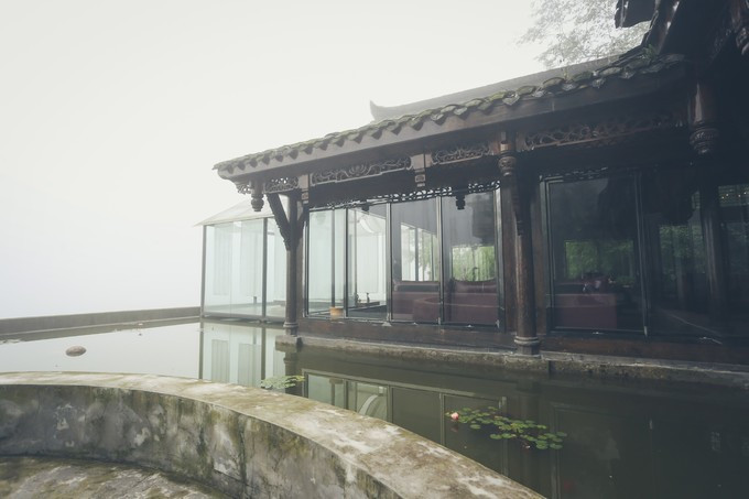 前台的侧面有一处270度落地窗环绕山境茶室,三面还围绕着池塘,小鱼儿来回自由的穿梭着,云雾缭绕着仿佛置身于云朵之中,喝着茶,仿若升仙一般。