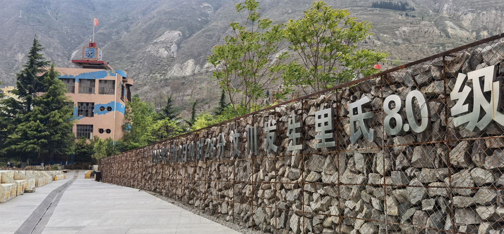 又经停汶川,参观了地震遗址,远处钟楼上的时针分针永远定格在那个不幸的时间点上。墙上是“2008年5月12日14时28分汶川发生里氏8.0级地震”。