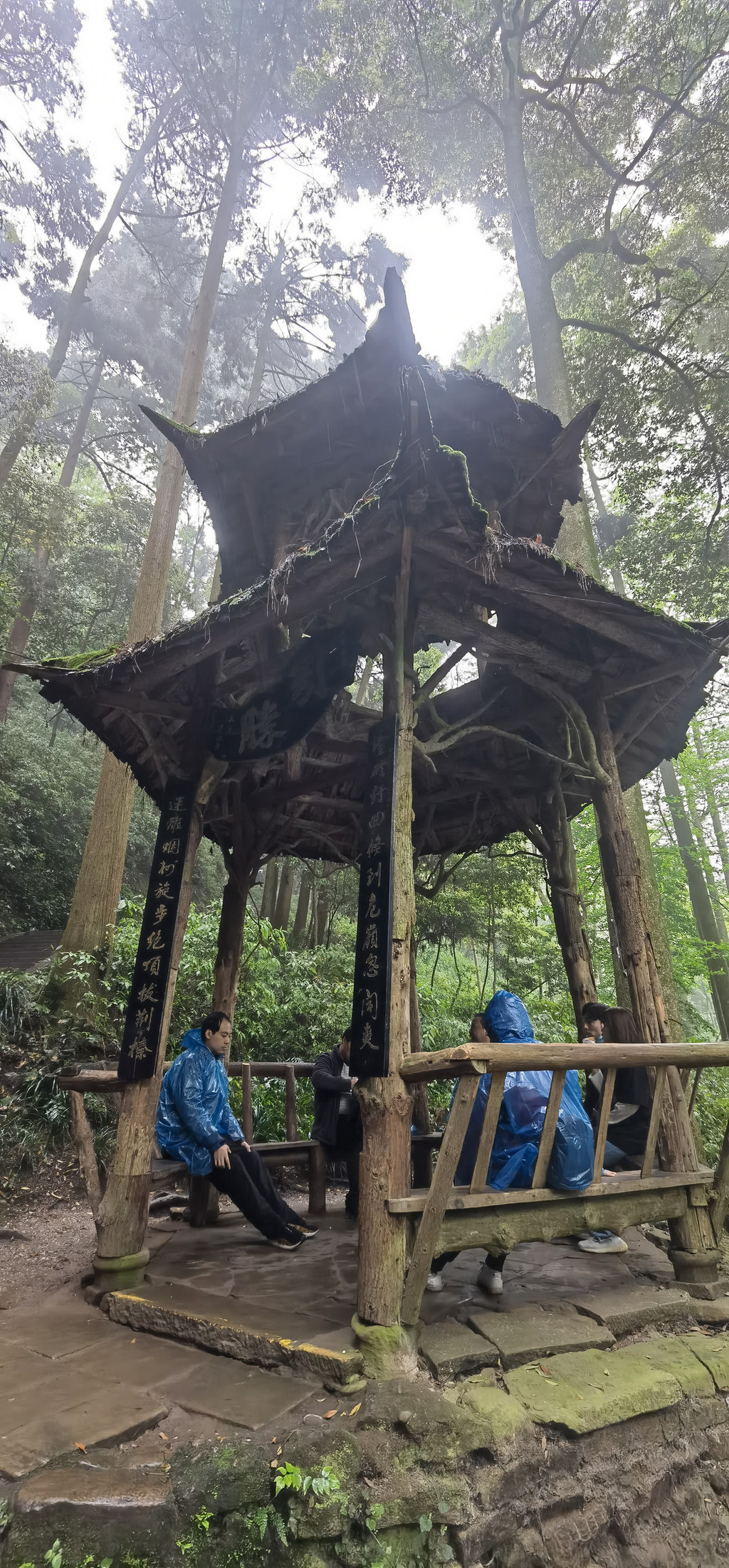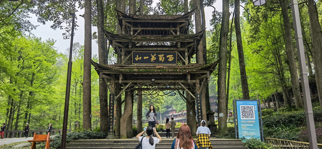 第一道山门,三重檐,树干为柱,树皮为顶,上有“西蜀第一山”,两侧有联: