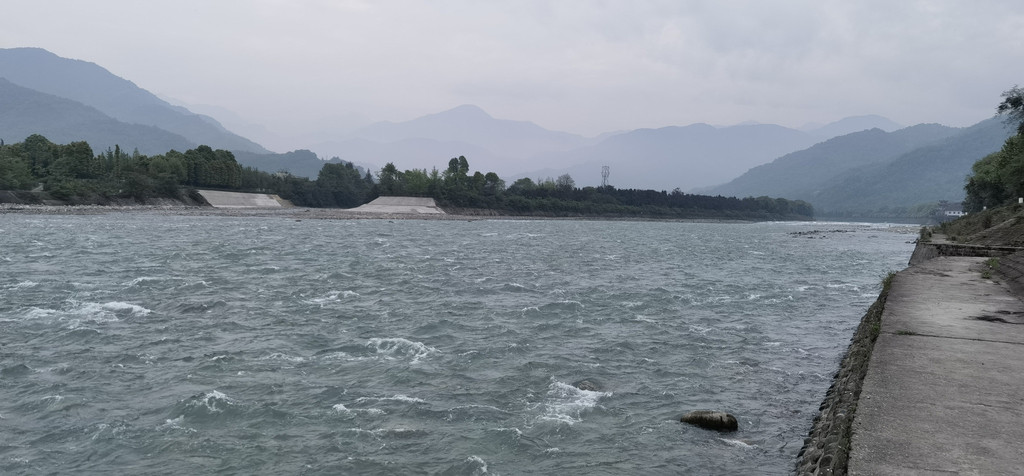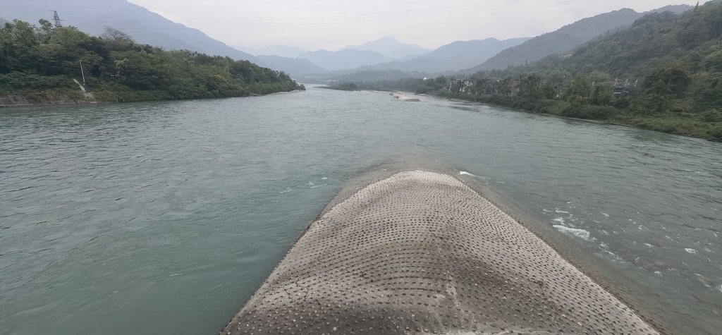 金马河,水面开阔,这是岷江的主流。远方右侧就是宝瓶口分水处。