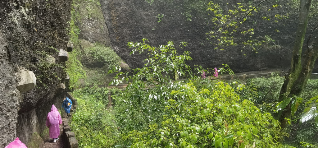 下起着小雨,我们穿着应急雨衣,行走在古龙蹻栈道上,有时要低头侧身,下为掷笔槽,头顶丹岩巨石,俯瞰狭道深谷,满眼青翠,奇险幽绝,一路说笑,心情舒畅。