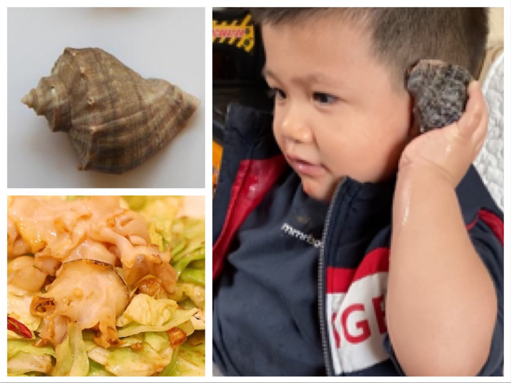 带着战利品,伴着晚霞我们离开了海滩,稍事休息,一家人直接在酒店用的晚餐,清淡饮食,没有大鱼大肉。点了青岛当地的蛤蜊肉炒小白菜,波波豆角、爆炒海螺、鱼香茄子和青岛大虾再加上一盘黄瓜水饺。一家人吃的非常舒服,价格也不是太贵,老爸老妈很满意。贴心的厨师把海螺壳洗干净送给了孩子:听——大海的声音~~~!