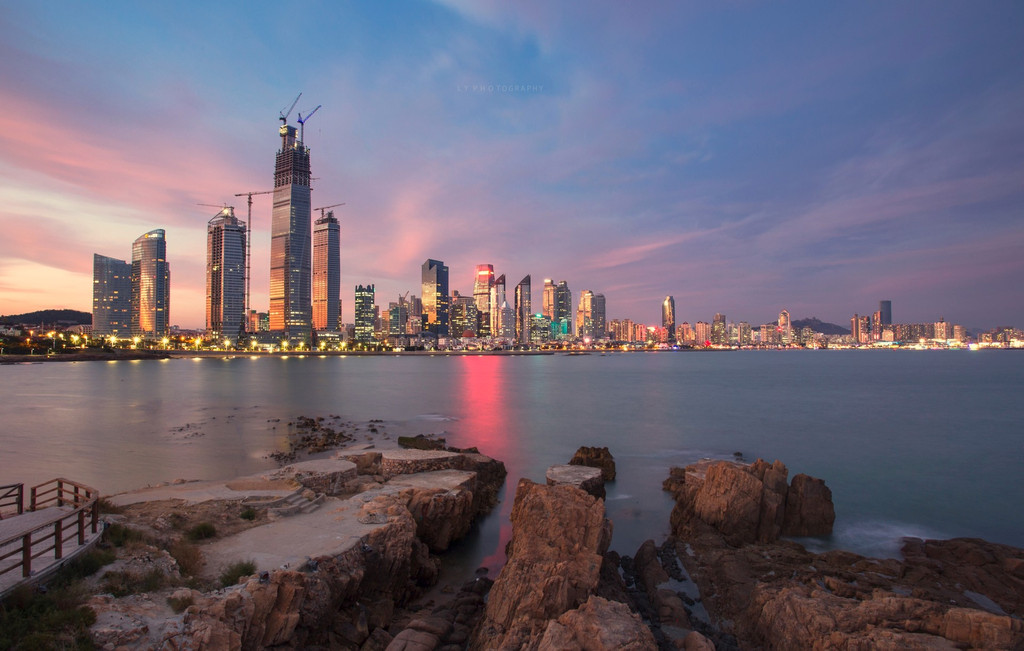 驶出银杏大道,视野又变得开阔起来。笔直的东海西路上,右侧是浮山湾,左侧是林立的高楼,新青岛赫然出现。波光粼粼的海水映衬着现代化的大厦,与刚刚经过的万国建筑群仿佛是两个世界,写满了新与旧的交替。