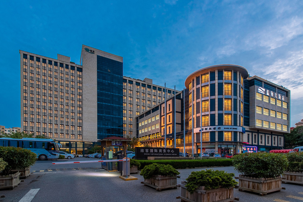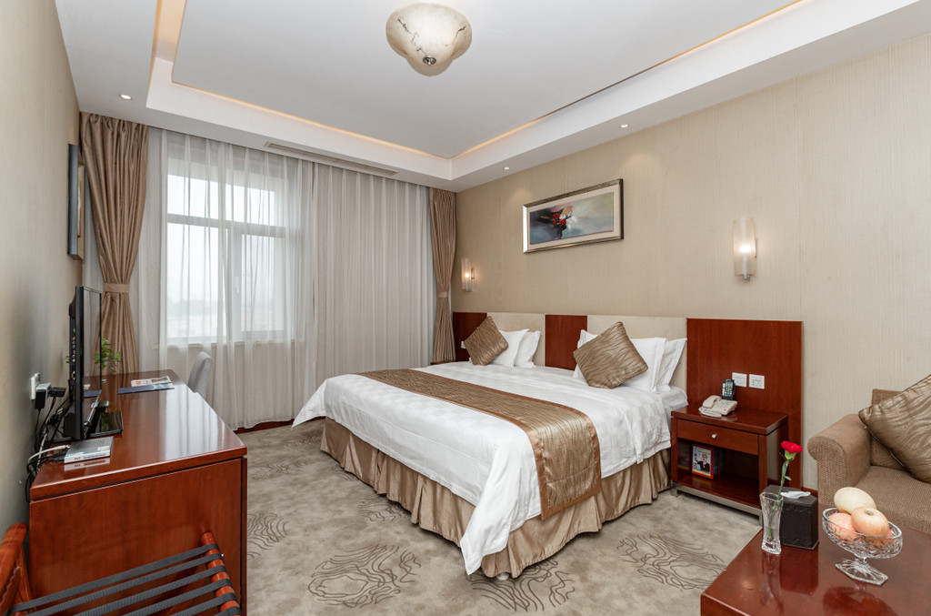说说我们选择的酒店吧,之所以旅行这么愉快,第一站的酒店给我的印象很好很好。我们选的是蓝海大饭店(青岛李沧君峰路地铁站店),主要是开始准备动车出行,距离火车北站非常近的星级酒店,网评也不错,青岛北站到酒店打车就10-15分钟,坐地铁三号线也就四五站的距离,而且是个美食饭店,吸引了我们。我们一家三口本来就想订个大床房,在携程定完之后打酒店电话咨询了一下,听说带孩子,接电话的小姐姐给我们推荐了一款名叫“好莱坞”的房间,床是2.2米宽的超级大,果断听小姐姐的。后来临近出发考虑还是自驾车方便一点,发现酒店也有超大停车场,很是难得。