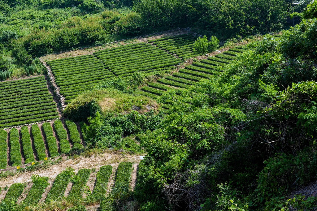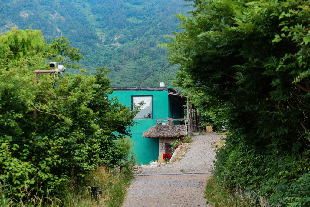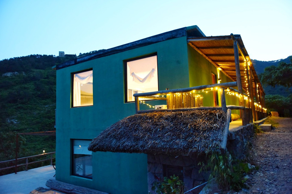 这是一处有灵魂有温度的房子,三栋绿色墙壁的房子充满了生机,远远望去,藏匿在青山渔村半山腰的百亩茶园中,依山傍海、远离闹市,闪闪发光、像是点缀在山海间的绿宝石,遗世而独立。