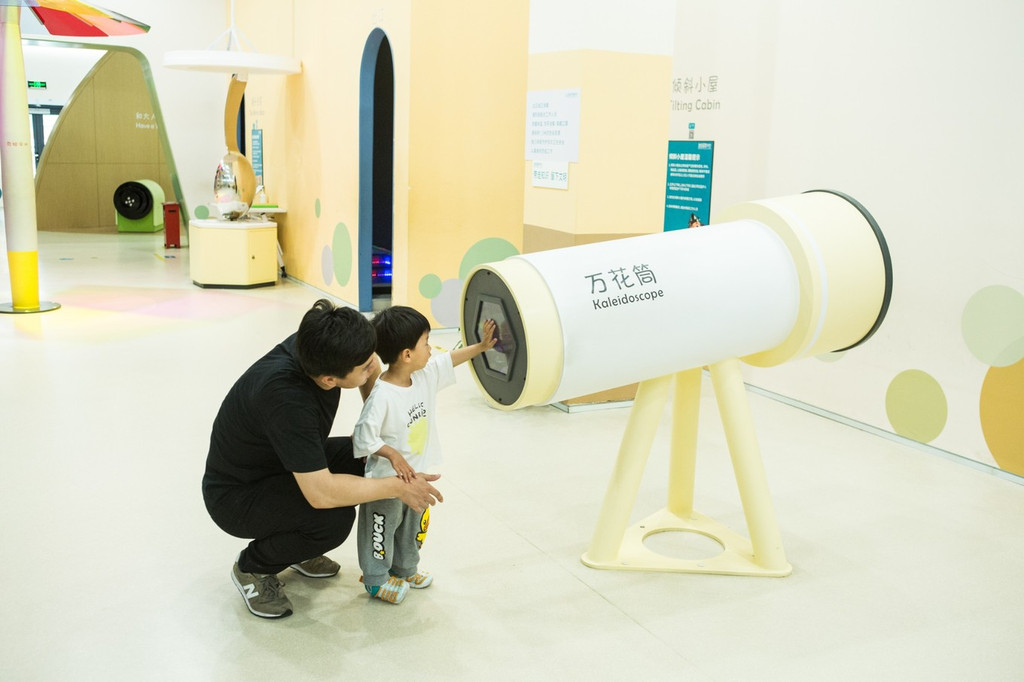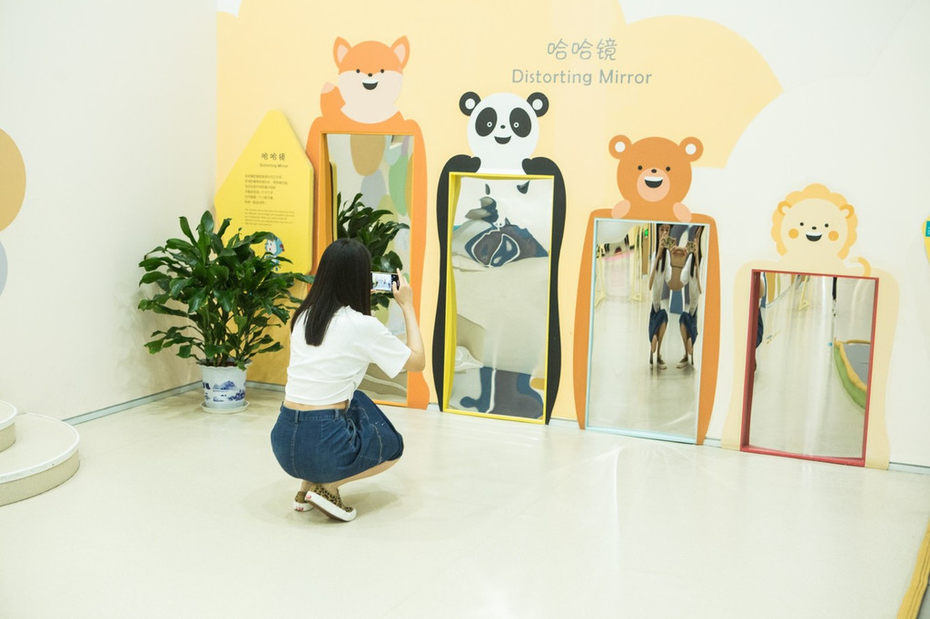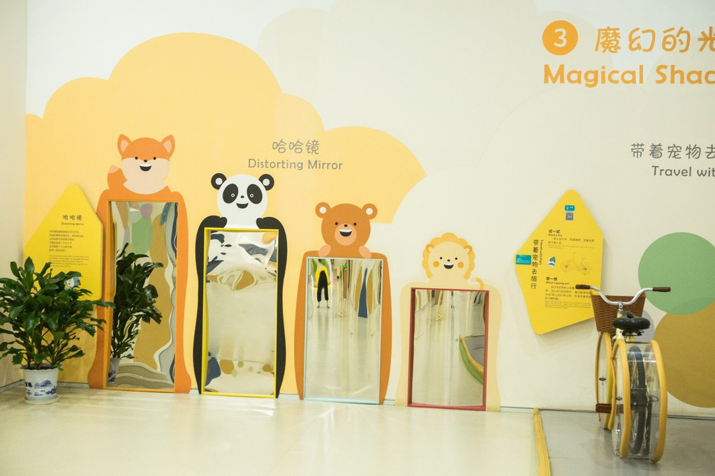 魔幻的光影展区通过镜子迷宫、万丈深渊、倾斜小屋、万花筒等展项,向孩子们介绍了光的折射与反射、视觉暂留和三基色原理等。