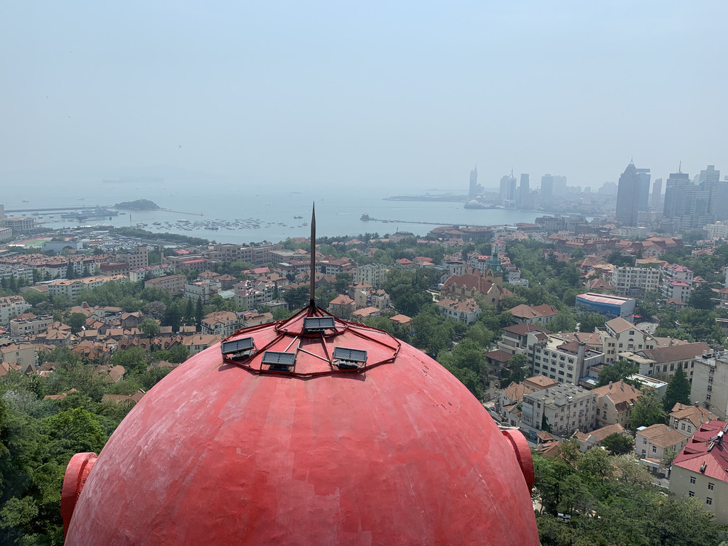 这三个大蘑菇分工各有不同,最大的是旋转景观楼,另外两个是邮电局微波站和娱乐厅楼。坐在旋转景观楼里,座椅会跟着转动,360°山光水色尽收眼底。平时只能仰望的电视塔、迎宾馆、教堂、栈桥等标志性建筑此时徐徐展开,遂叫人心旷神怡,也明白了为什么要把青岛叫做“东方瑞士”。若不是时间的关系,真能在这里坐上一整天。
