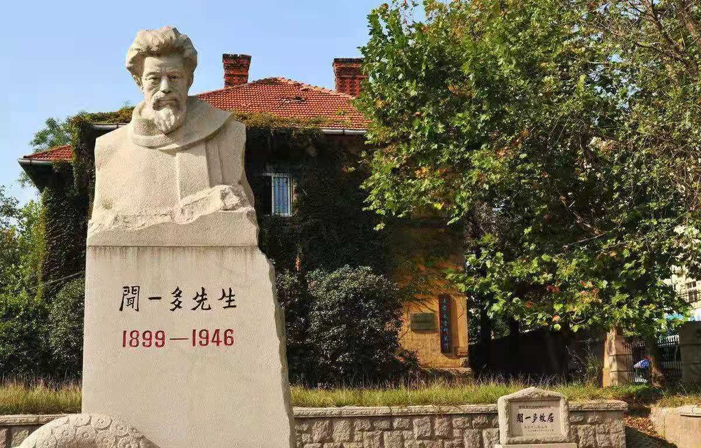 我最喜欢位于鱼山路5号中国海洋大学内东北角处的闻一多故居,这座红瓦覆盖的两层德国风格小洋楼原为德国军官宿舍,后来闻一多住在朝南的一间房子里,就变成了“一多楼”。如今先生的纪念碑立在院落之前,雕像低眉沉思,深情凝重,碑后有其学生臧克家撰写的碑文,短短百余字,道出了他为国难的忧虑和高风亮节。