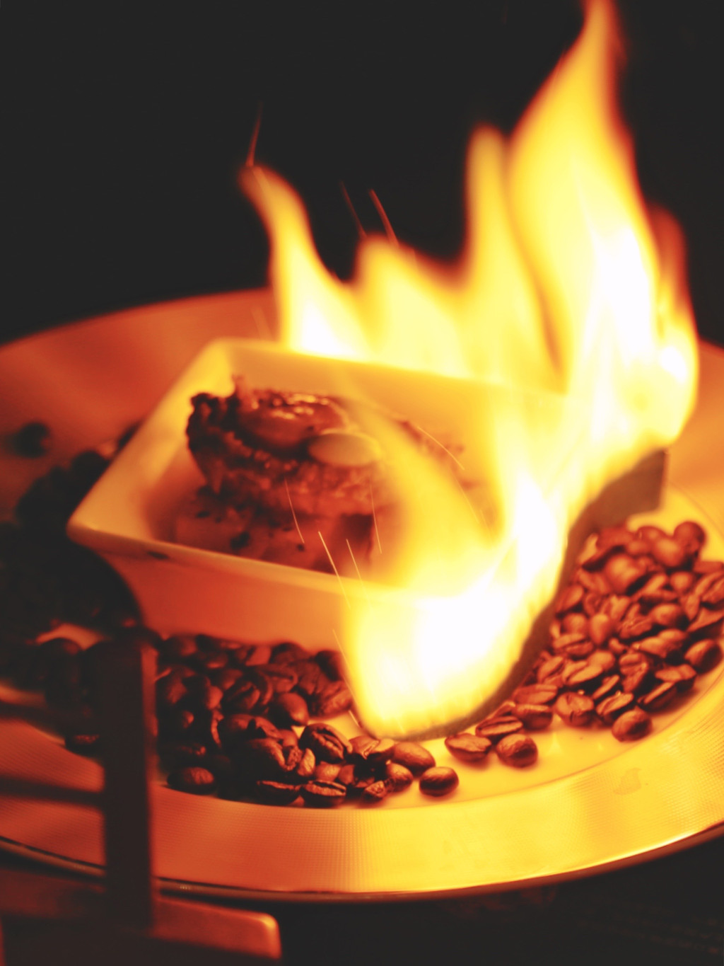 关掉灯光点燃魔术纸,燃尽后出现用鸡汤煨了4小时的鲍鱼,下面的土豆吸足汤汁口感浓厚