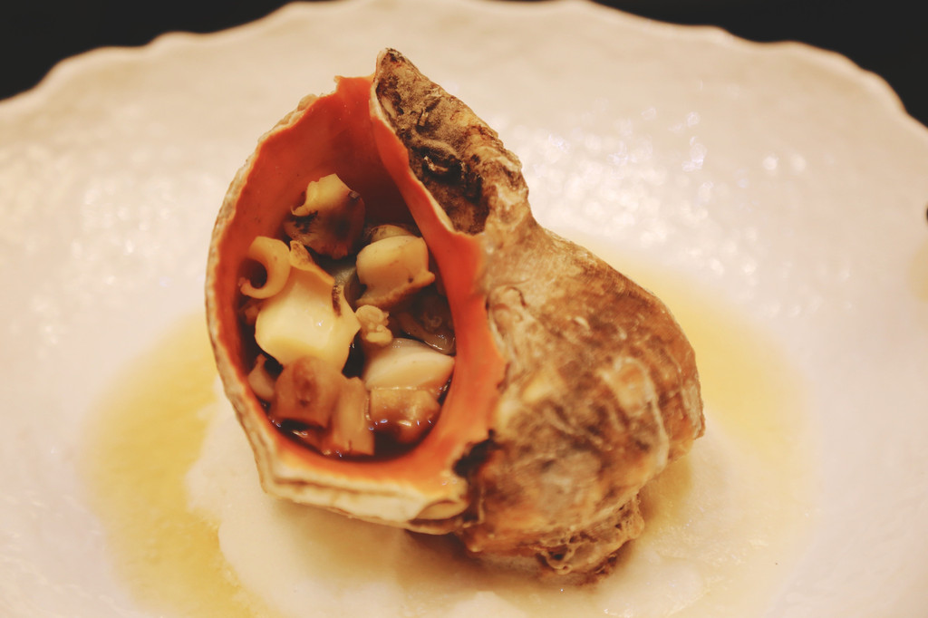 海螺松茸汤,绚烂的火焰熄灭,螺肉香韧,松茸鲜美,最后举起海螺把汤汁一饮而尽,wow~