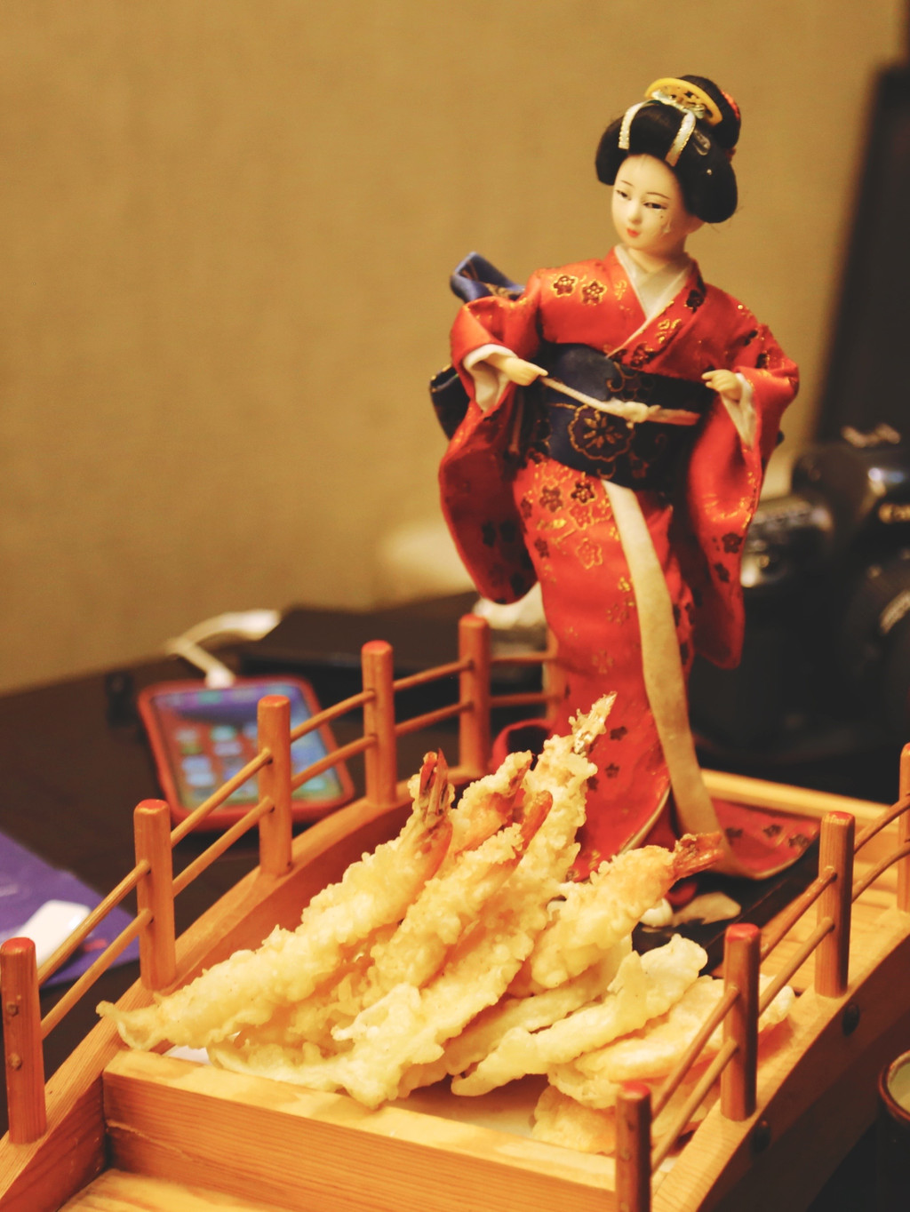 天妇罗装饰了小桥和穿着和服的少女,像一件艺术品,不忍动筷