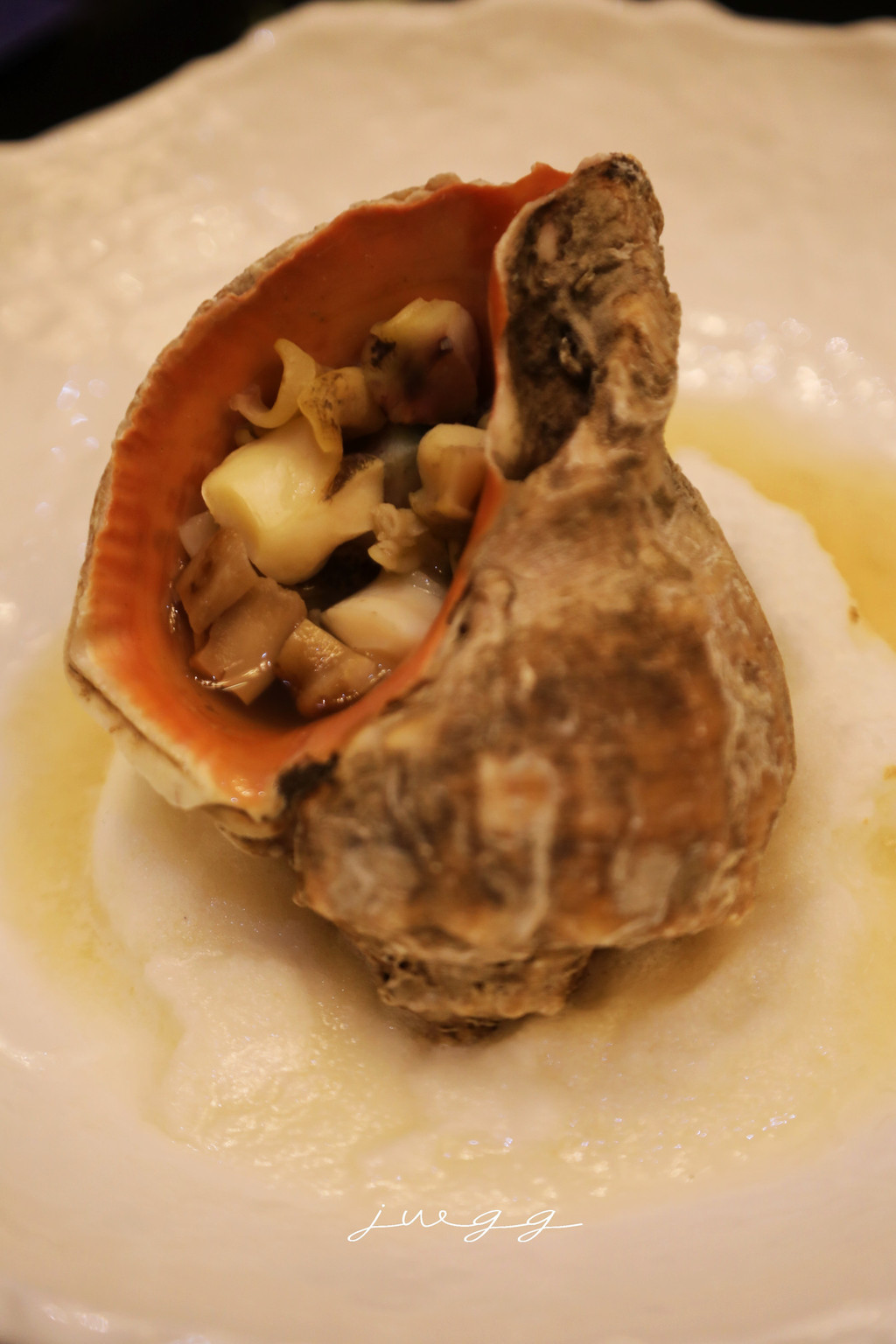 海螺松茸汤比较吸引我,海螺壳为器皿,里面是海螺肉和松茸汤,汤汁鲜美,有一点点松茸的味道更多的是海螺的鲜味儿,上菜的时候还会燃起火焰,特别惊喜