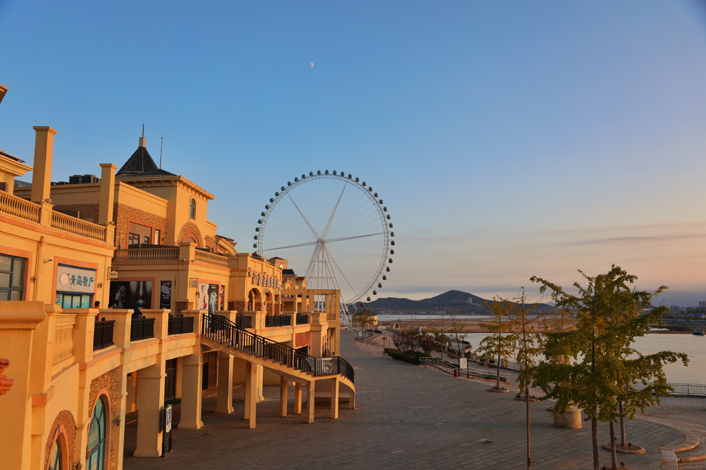 酒店旁边步行5分钟左右就有一条商业街,商业街里有一些常见的大牌价格都很优惠。穿过商业街就可以看到一个巨型摩天轮。高88米,目前是青岛最高的摩天轮——海洋之星摩天轮。
