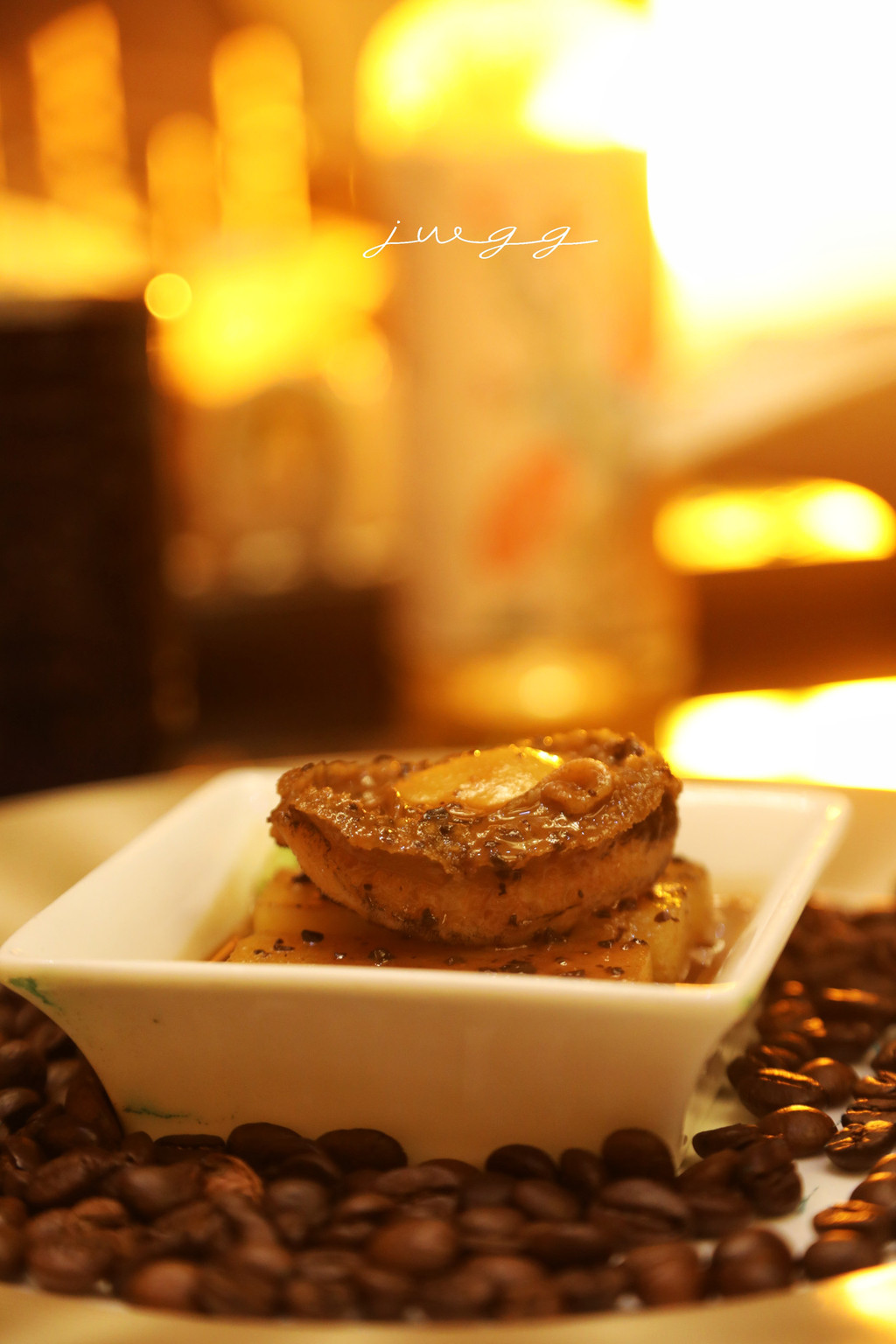 鲍鱼用老汤煨了4个多小时,有一点点鸡汤的鲜,又有鲍鱼独有的嫩滑嚼劲。上菜的时候用魔术纸围起来点燃,有一种看魔术表演的既视感。