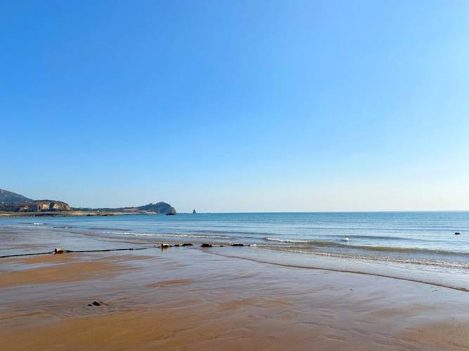 石老人海水浴场的沙子特别细腻,踩在上面,软软的。这的海水也特别清澈,就好像到了青海,看到了茶卡盐湖和青海湖似的。