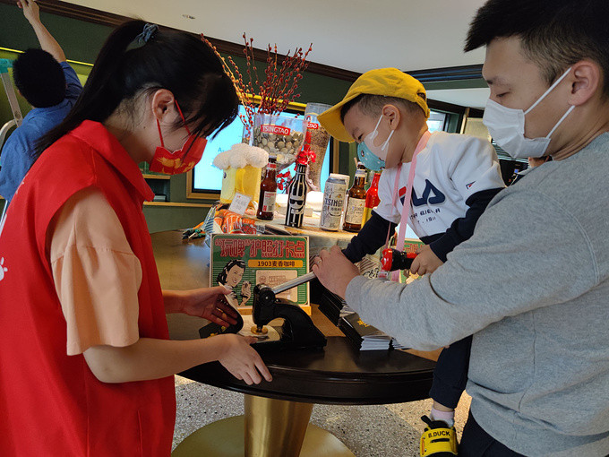 在这里每个人可以领到一包下酒用的花生米,和一杯非常地道、甘香醇烈的青岛啤酒。