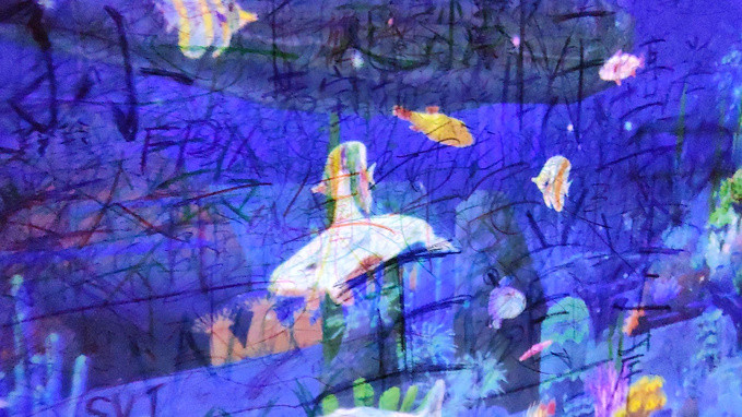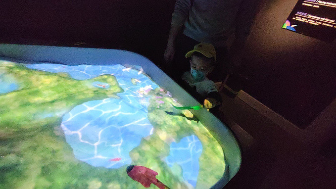 自己动手涂鸦一条可爱的小鱼,然后通过扫描投影到蓝色的大海里。那种惊喜的感觉让人兴奋不已。