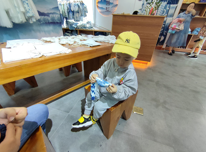 偶然走在途中,发现了一家扎染的布艺店,想着麦兜同学上一次的扎染作品没有成功,可以再体验一次,于是带着他进去做了一双小袜子。作品还不错,麦兜很喜欢。