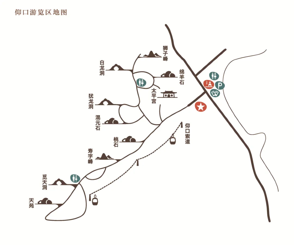 进入景区后,左侧是索道(往返25分钟,如果是坐单程,建议徒步上,索道下,可以在索道上看海景);右侧为徒步游览线路,全线路为:太平宫——狮子峰——犹龙洞——仙桃——寿字峰——觅天洞——天苑,全程游览时间大约2.5小时。