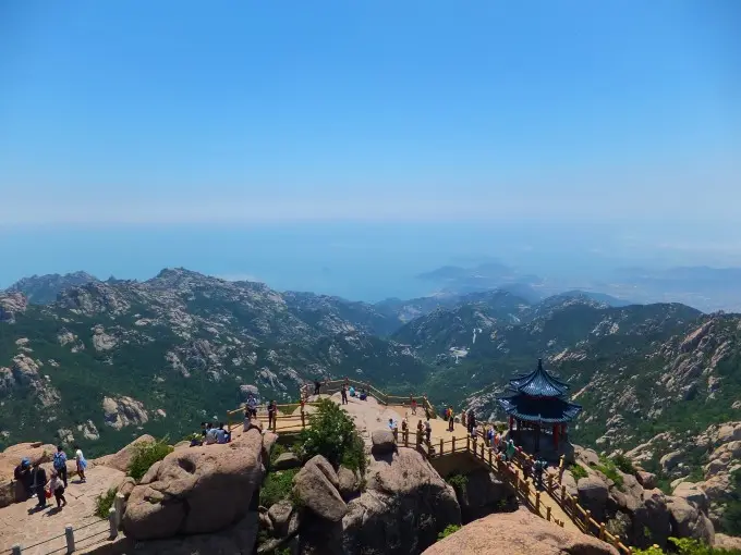 【巨峰游览区】俗称“崂顶”,海拔1133米,是我国大陆1.8万公里海岸线上最高的山峰,在巨峰四周有一条环山游览路,站在多数路段上能远眺大海。环线上有根据易经八卦命名的八个山门,对应周边八个山口;到巨峰游览须乘观光车上山,下了观光车,可乘坐索道(15分钟)或步行上山(1.5h);若体力不佳,可选择沿右侧线路登高直上最高点“灵旗峰”,往返需要1.5小时左右;若体力充沛,可选择沿左侧线路游览至五峰仙馆,往返需要2.5小时左右。